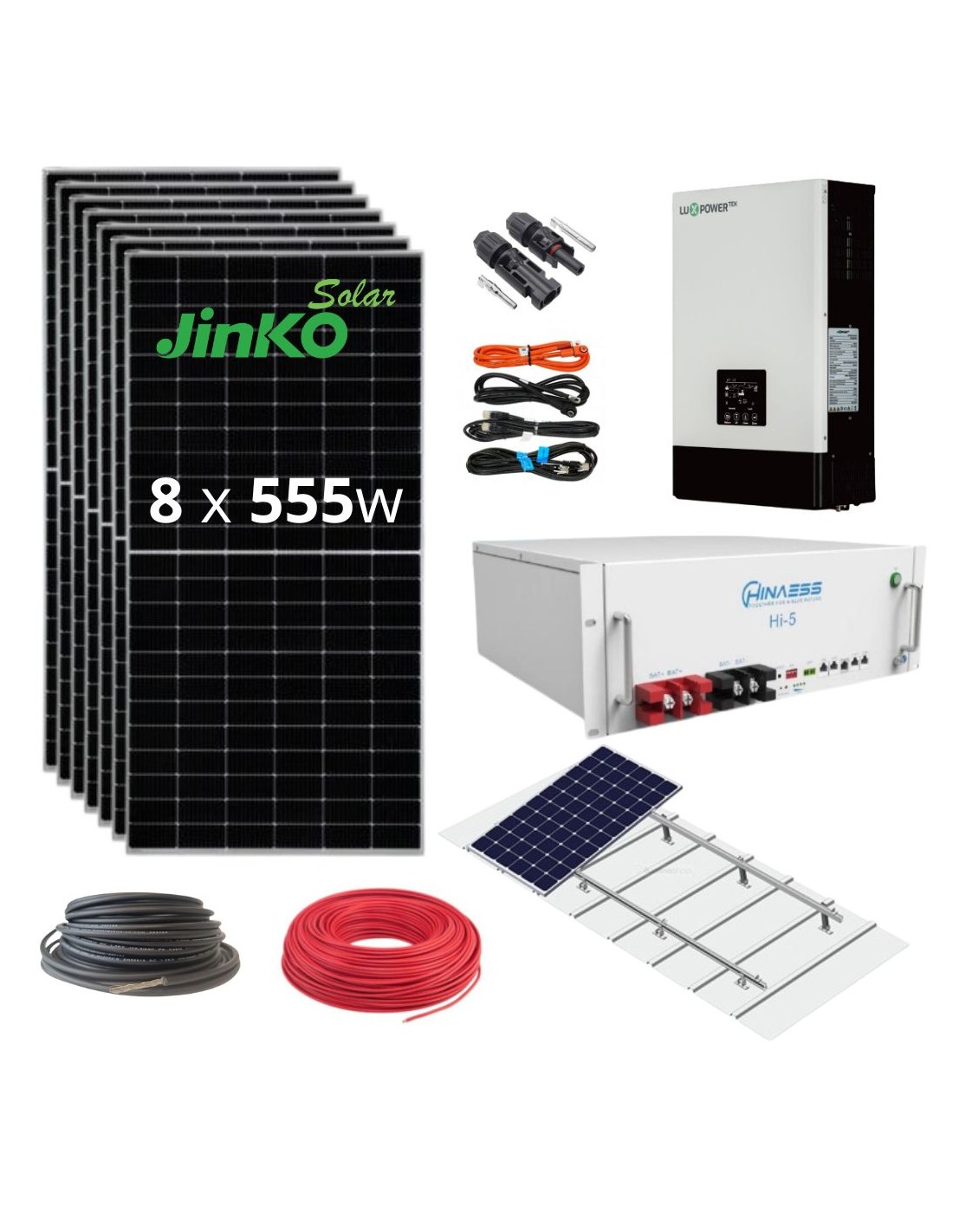 8 x Panel solar 555w Jinko Solar: La placa solar es uno de los elementos más importantes de nuestra instalación solar ya que es la encargada de convertir la radiación solar en energía en CC.